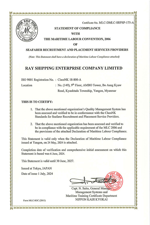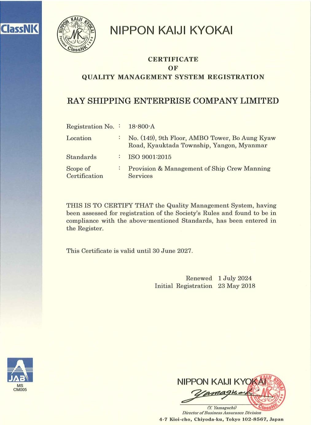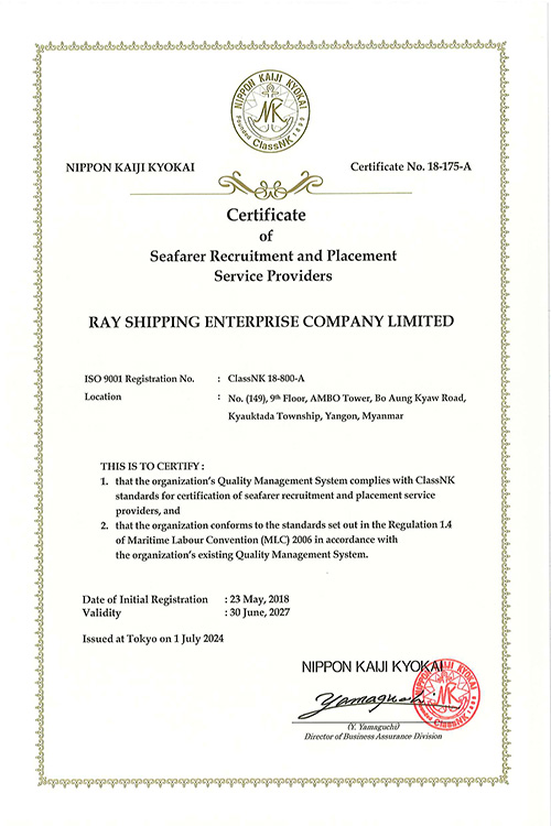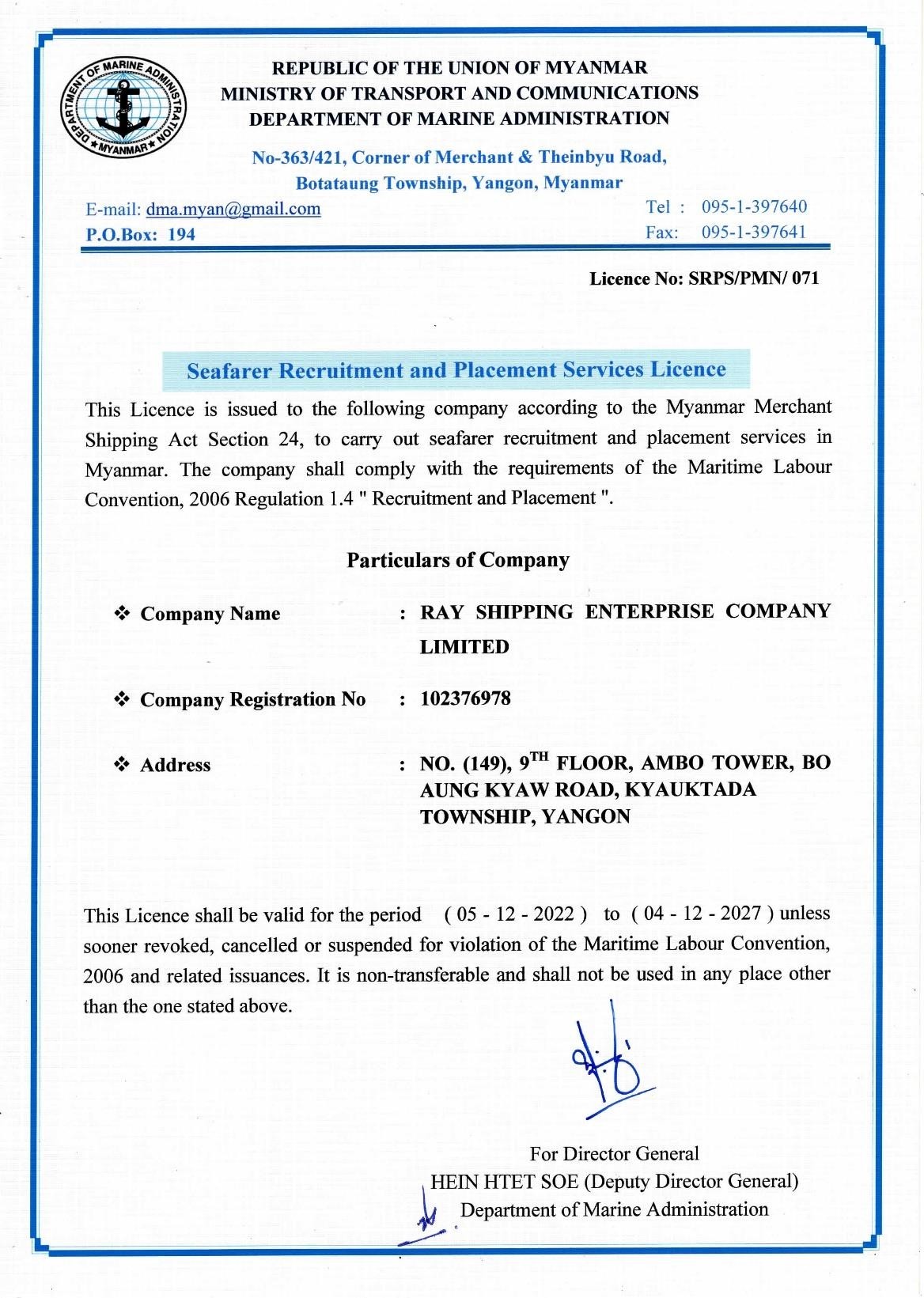 In the year 1991 Ray Shipping Enterprise Co., Ltd was established and the company was officially registered with Seaman Employment Control Division (SECD), Now Seafarer Department ( SD ) and the Ministry of Transport in the country of Myanmar to provide ship Owners our ship Management companies the best services with the assurance of systematic efficiency.